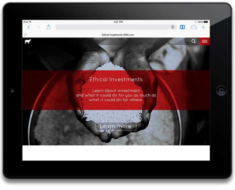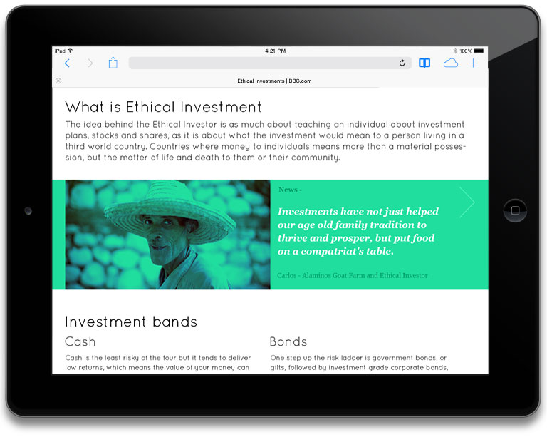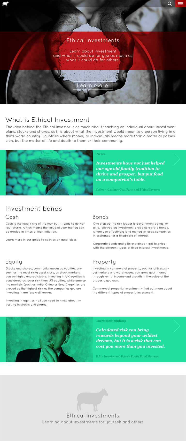 The idea behind the Ethical Investor is as much about teaching an individual about investment plans, stocks and shares, as it is about what the investment would mean to a person living in a third world country. Countries where money to individuals means more than a material possession, but the matter of life and death to them or their community. Users are invited to stipulate an amount they would invest, and in turn through real-time calculations they would be shown the type of financial return they would expect back. They would also be able to see a comparative scale of that investment return and what it would mean to someone from a third world country. Supplementary information would be accessible regarding the different types of investment risks and the areas they cover: Cash, Bonds, Property and Equity. The rewards achievable as well as the unpredictably and uncertainty they carry. Users would also be able to view and play an animated timeline to see historical performance data. As the timeline moved the graphical elements would change in accordance to returns through that time period. This would display tangible information as to what could happen in prosperous times as well as times of financial hardship and stock market crashes. As an instruction tool into the world of finance, there is also an underlying ethical story. Users could be invited to invest actual money; a transaction which would be facilitated by the client. In turn they would invest the money into ethical companies. You could follow your investment as it grows and see what it is providing for others. If I could see where and what my £10 does, maybe I would be happier making continual donations. Visit Ethical Investor.
