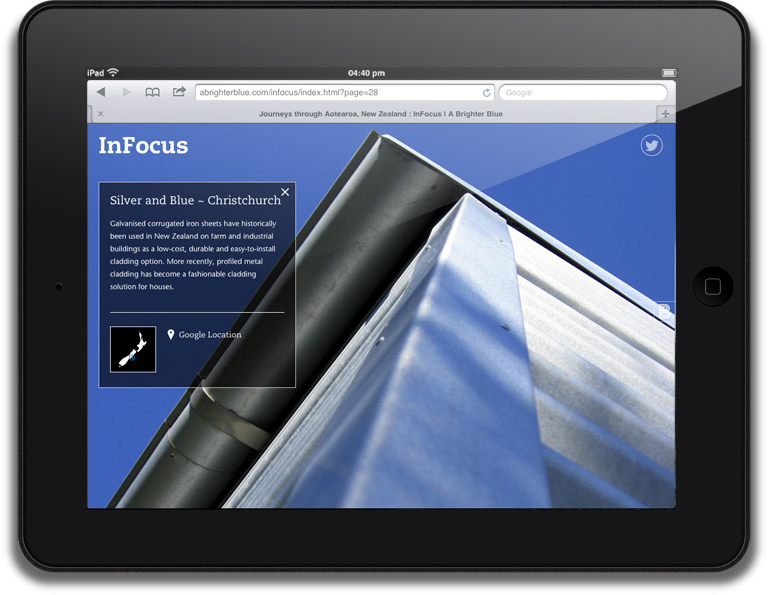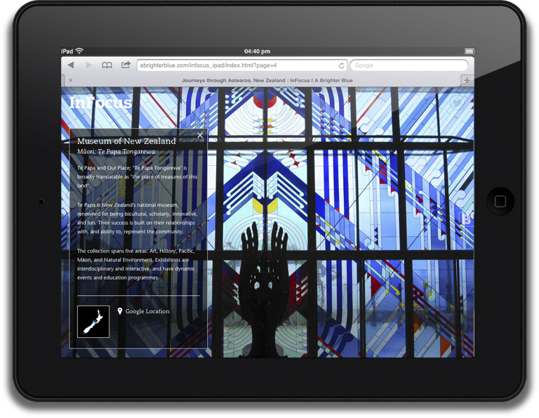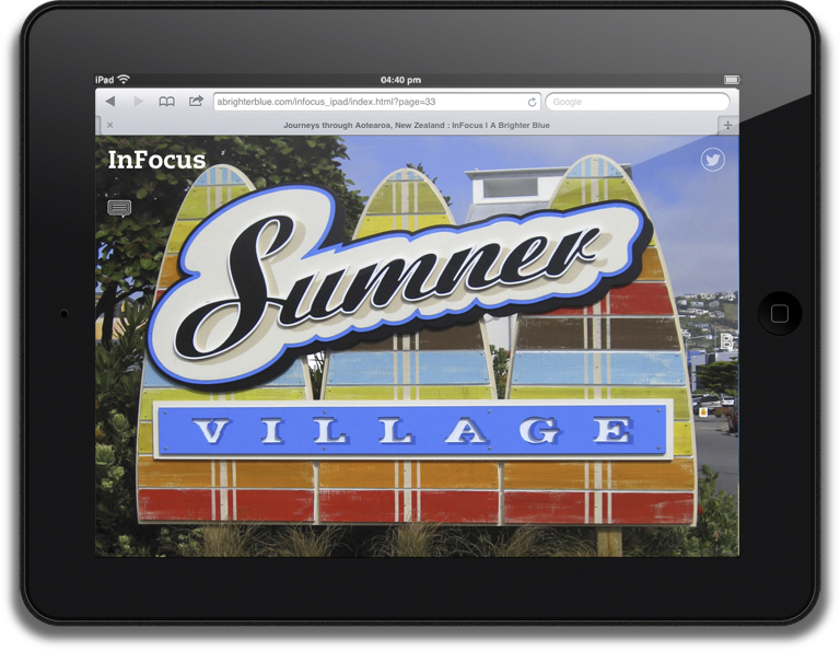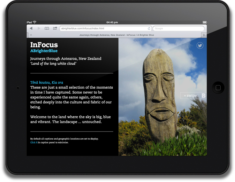 InFocus is a project from the heart. Merely a snapshot, these are a collection of photographs I have taken whilst on holiday with my family in New Zealand. They have been compiled into a digital magazine complete with caption texts, Māori translations and historical facts.