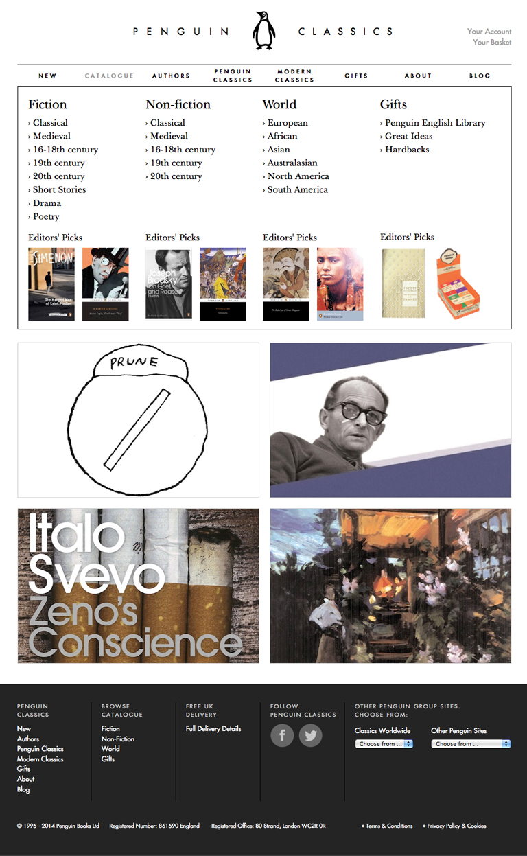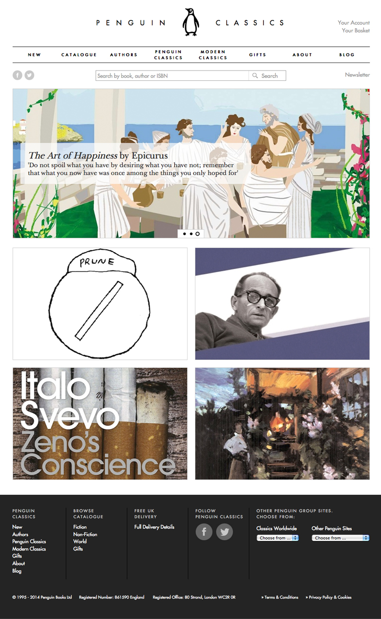 The Penguin Classics redesign takes a new cleaner and more minimal approach. Bringing its award winning book design, editorial and author list to the fore. Using a vibrant colour palette by means of jacket imagery and simple typography, the new site leaves the UI free of visual noise.