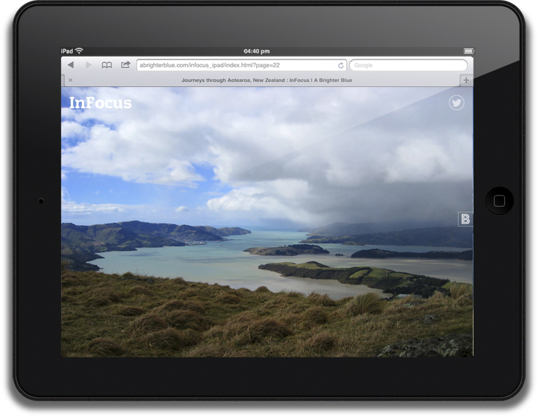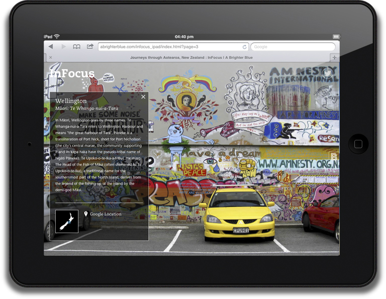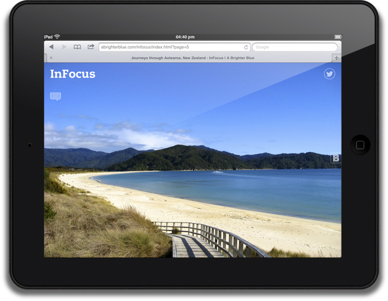 InFocus is a project from the heart. Merely a snapshot, these are a collection of photographs I have taken whilst on holiday with my family in New Zealand. They have been compiled into a digital magazine complete with caption texts, Māori translations and historical facts.