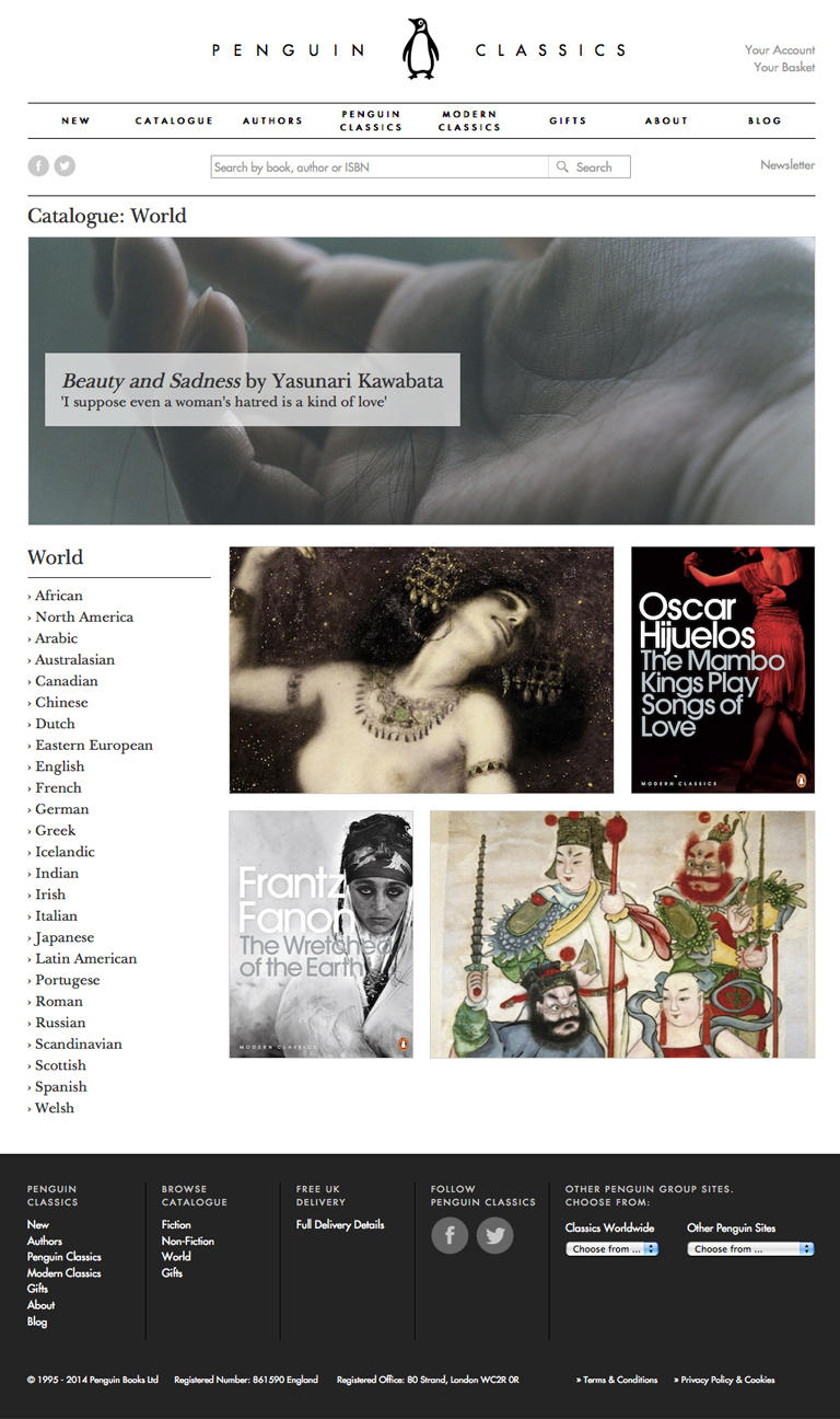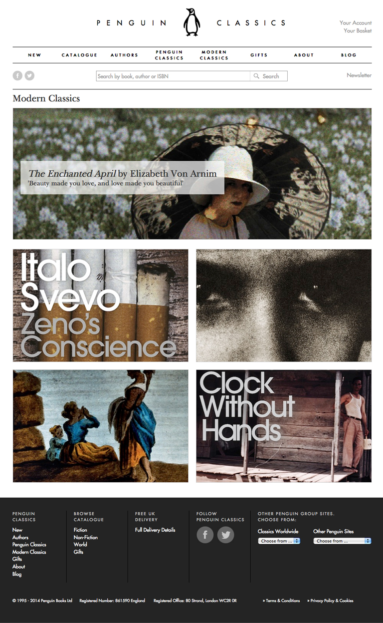 The Penguin Classics redesign takes a new cleaner and more minimal approach. Bringing its award winning book design, editorial and author list to the fore. Using a vibrant colour palette by means of jacket imagery and simple typography, the new site leaves the UI free of visual noise.