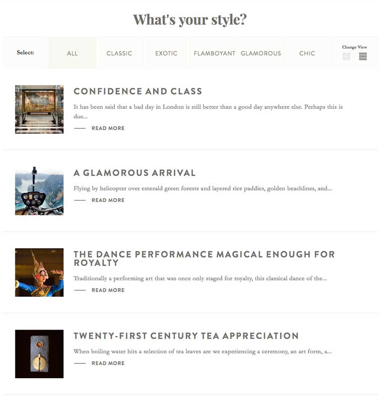 As part of our response it was decided to create 7 long form article each split into 3 sections as well as offering opportunities to direct the users through to Rosewoods online magazine, Rosewood Issues. In short, an overall editorial proposition of 30 pieces of content. The question was - how do we showcase all of this in an engaging way that not only excites the user, but doesn't feel like a micro site of promotional literature. Bearing in mind Rosewood already does this via their own site. So what would be our separation and point of difference. 30 pieces of content is a substantial and possibly daunting amount for the user to navigate, however as a benchmark we had not long completed a project for Dubai Tourism that offered 90 pieces of content utilising the masonry format. Therefore 30 pieces was a relative walk in the park and the obvious solution was the masonry format - this would be our point of separation and difference.The Result